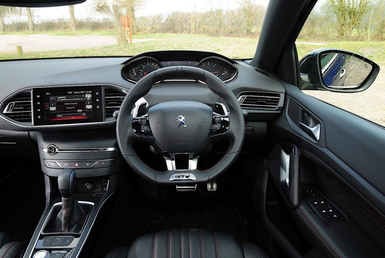 Fundamentalna w samochodzie sportowym, pozycja za kierownicą jest idealna dzięki ergonomii i-Cockpitu Peugeota. Kierowca może regulować wysokość i zasięg kompaktowej kierownicy, wyjątkowej dzięki perforowanej skórze i znakowi GT. W polu widzenia, panel instrumentów ma nowy motyw flagi szachowej. Po włączeniu zapłonu, kierowca witany jest komunikatem GT, a na dużym ekranie dotykowym wyświetla się nowa kolorystyka dominująca w czerwieni i czerni, zatytułowana Redline.