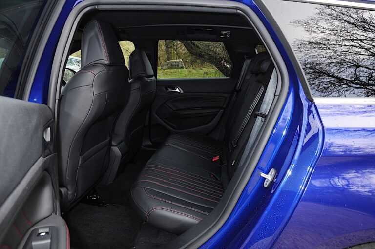 Wewnątrz było więcej miejsca niż w standardowym hatchbacku, zwłaszcza z tyłu. Deska rozdzielcza miała opływowy kształt, była prosta i schludna, a jedynym elementem ją przerywającym był ekran infotainment, który wpisywał się w koncepcję pływającego designu. Fotele kubełkowe z przodu oraz tylna kanapa były pokryte skórą z kontrastowym przeszyciem. Składając oparcie tylnej kanapy, 308 SW GT oferował więcej przestrzeni bagażowej niż BMW serii 5 Touring z tego samego okresu, mimo że był krótszy od niemieckiego kombi premium.