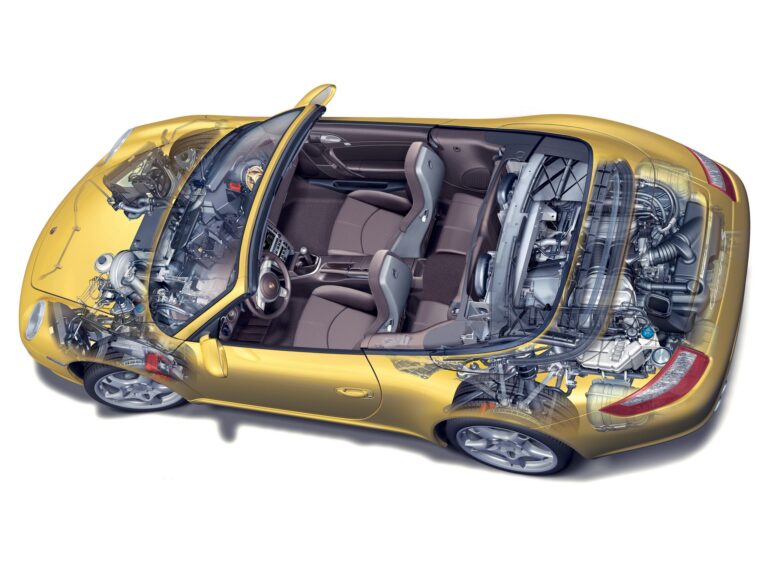 Niższy środek ciężkości wynika również z przemyślanej konstrukcji podwozia Porsche 911 z 2005 roku, które posiada niższą pozycję siedzenia.