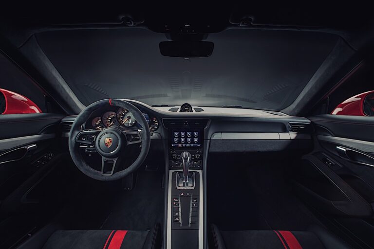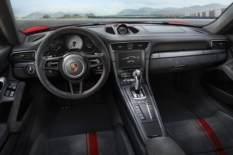 Wnętrze nowego wysokowydajnego samochodu sportowego jest dostosowane do doświadczenia jazdy 911 GT3. Kierownica GT o średnicy 360 mm pochodzi z modelu 918 Spyder. Zarówno kierowca, jak i pasażer doświadczają dynamiki w fotelach Porsche Sport Plus z wzmocnieniami bocznymi i mechaniczną regulacją przód/tył. Wysokość fotela oraz oparcia są regulowane elektrycznie. Ponieważ 911 GT3 tradycyjnie jest dwuosobowym samochodem, tylne siedzenia są przykryte.