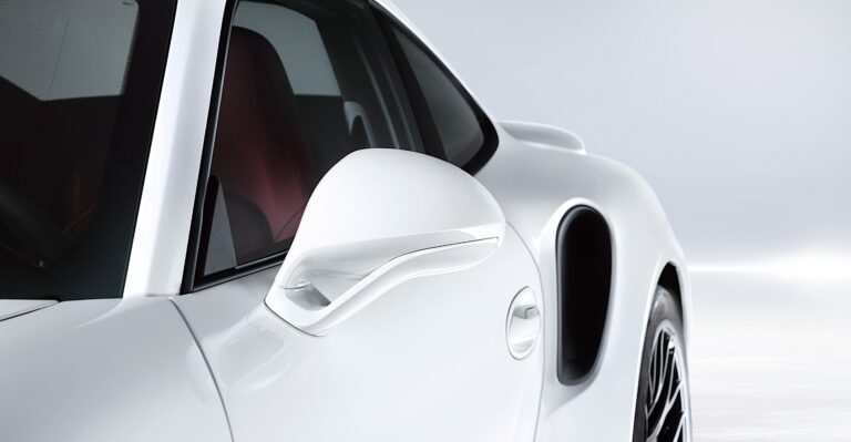 Skupienie się na kluczowych cechach modelu 911 Turbo jest również widoczne z boku. Na postoju i w miejskim ruchu nie ma krawędzi spojlera, która zakłócałaby purystyczną formę linii przedniej 911. Wyraźnie i bezbłędnie typowe dla Turbo, wlot powietrza dla intercoolera otwiera się przed osią tylną. Punkt końcowy wizualnej tzw. „linii lotu” tworzy charakterystyczny tylny błotnik, który jest w nowej generacji bardziej zintegrowany w ogólnym designie. Nowe modele 911 Turbo mają znacznie bardziej dynamiczny ogólny wygląd w profilu bocznym z powodu połączenia krótszych zwisów nadwozia z przodu i z tyłu oraz wydłużonej linii bocznej z o 100 mm dłuższym rozstawem osi. Kolejny wizualny akcent tworzą nowe 20-calowe felgi aluminiowe w wyglądzie dwukolorowym. W modelu 911 Turbo mają dziesięć podwójnych ramion, a w modelu S cechują się szczególnie delikatną strukturą z dobrze rozgałęzionym wzorem ramion – oraz z blokadą piasty.