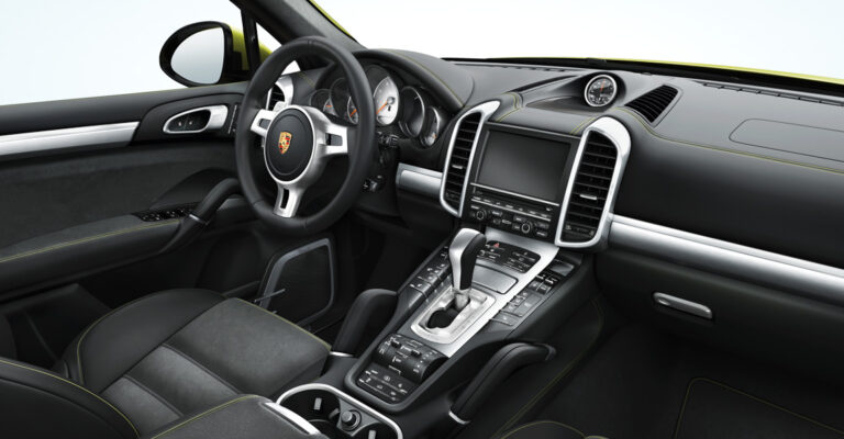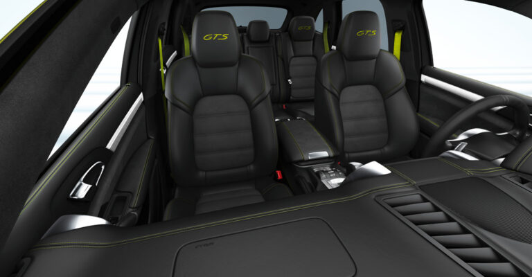 Połączenie ekskluzywności i sportowości również znajduje odzwierciedlenie w wnętrzu Cayenne GTS. Zawiera ono skórzaną tapicerkę jako standard, w tym liczne wykończenia z Alcantary. Na przykład, środkowe panele siedzeń, podłokietnik konsoli środkowej, części panelu drzwi oraz podsufitka i wykończenia słupków są wykonane z Alcantary. Kierowca i pasażer z przodu siedzą na ekskluzywnych sportowych fotelach GTS z ośmioma regulacjami elektrycznymi. Tylne fotele w stylu pojedynczym oferują pasażerom tylnym doskonałe wsparcie boczne. Z kierownicą SportDesign, która ma łopatki do zmiany biegów, przygotowano do ręcznych zmian biegów, która harmonijnie współgra z purystycznym wnętrzem. Kierownica SportDesign dostępna jest również z obręczą kierownicy z Alcantary jako opcja.