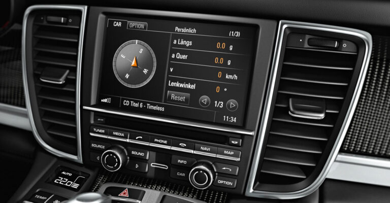 Zwinność Porsche Panamera GTS jest widoczna na każdym zakręcie. Wyświetlacz przyspieszenia bocznego i podłużnego teraz również umożliwia kierowcy jego obserwację. Wyświetlacz w prawej rurze zestawu wskaźników oraz opcjonalny system Porsche Communication Management (PCM) informują kierowcę o bieżącym przyspieszeniu, odzwierciedlając potencjał wysokich prędkości w zakrętach i osiągi Panamera GTS.