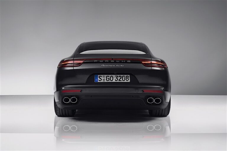 Fakt, że Panamera to czterodrzwiowe coupe, a nie konwencjonalny sedan, jest bardziej oczywisty z tyłu niż z każdej innej perspektywy. „Szklarnia” – składająca się z dachu, słupków dachowych, powierzchni okien – wspierana jest przez mocną i szeroką sekcję barkową. Wyraźnie Panamera, zdecydowanie samochód sportowy. Najbardziej wyraźnymi elementami identyfikującymi tylną część nadwozia są bez wątpienia trójwymiarowe tylne światła LED zintegrowane z czteropunktowymi światłami hamowania. Lampy tylne są połączone wąską taśmą LED. Wszystkie te elementy razem tworzą niepowtarzalny projekt nocny. Zintegrowany bezproblemowo i elegancko w bagażniku, który ma elektryczne otwieranie i zamykanie w standardzie, jest wysuwany tylny spojler, który teraz jest wykończony w kolorze nadwozia. W Panamera Turbo skrzydło również dzieli się podczas rozciągania, zyskując dodatkową powierzchnię. Dolna tylna część nadwozia kończy się dyfuzorem, w który po lewej i prawej stronie zintegrowane są podwójne stalowe końcówki wydechu. Panamera 4S i 4S Diesel można rozpoznać po okrągłych końcówkach wydechu, podczas gdy Panamera Turbo ma trapezoidalne końcówki wydechu.