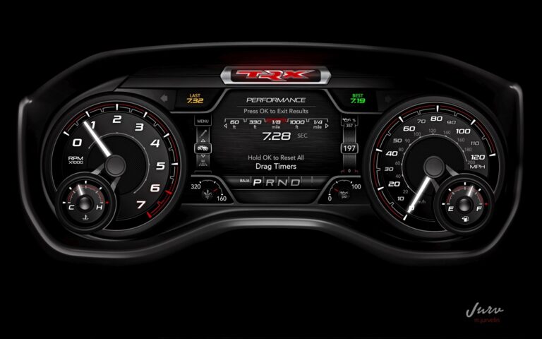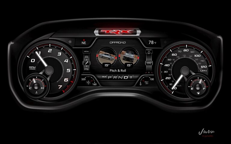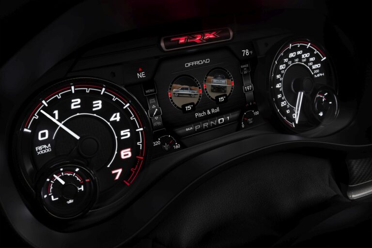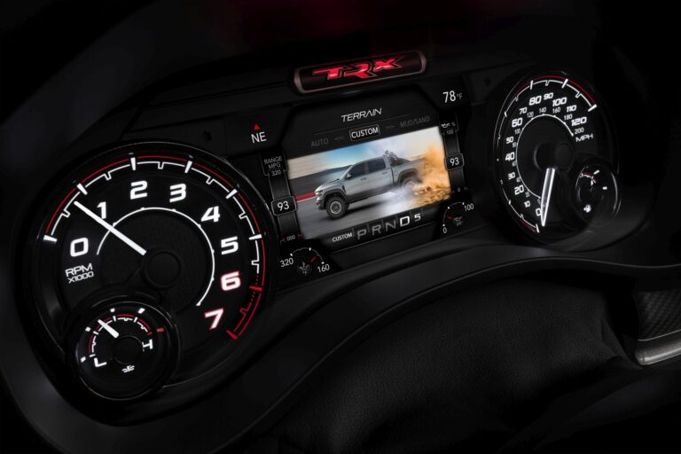 Ram TRX korzysta z 7-calowego wyświetlacza TFT, który jest ekskluzywny dla modelu i ma podświetlone logo TRX, unikalne kolory i grafiki w formie reconfigurowanych wskaźników. Te same grafiki pojawiają się również na 12-calowym ekranie dotykowym Uconnect 4C. To pierwszy raz, gdy tryby jazdy i strony wydajności terenowej są wyświetlane na 12-calowym ekranie Uconnect 4C.