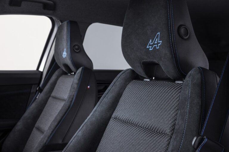 Wnętrze wersji Esprit Alpine wyróżnia się także wieloma charakterystycznymi elementami: niebieskie przeszycia i lamówki; unikalna tapicerka z Alcantary z tkaniną w splot carbon; skórzana kierownica Nappa z wkładkami z Alcantary oraz niebieskimi, białymi i czerwonymi przeszyciami; pedały z aluminium i progi drzwiowe z logo 'Alpine’.