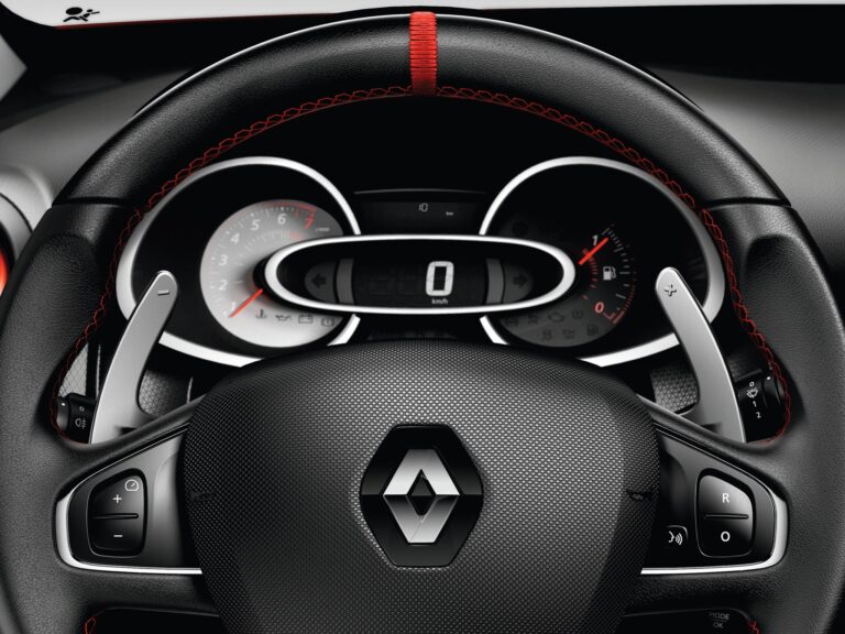 Ciemne metalowe łopatki zmiany biegów są umieszczone za kołem kierownicy, podczas gdy szare tła instrumentów są specyficzne dla Clio RS. Gdy silnik jest uruchomiony, wskazówki obrotomierza i wskaźnika paliwa ożywają w zabawnym wyświetlaczu.