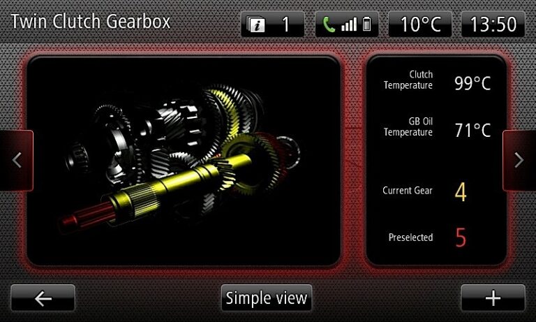 - Graficzny wyświetlacz wewnętrznych części przekładni EDC: wybrany bieg, wstępnie wybrany bieg, temperatura sprzęgła.