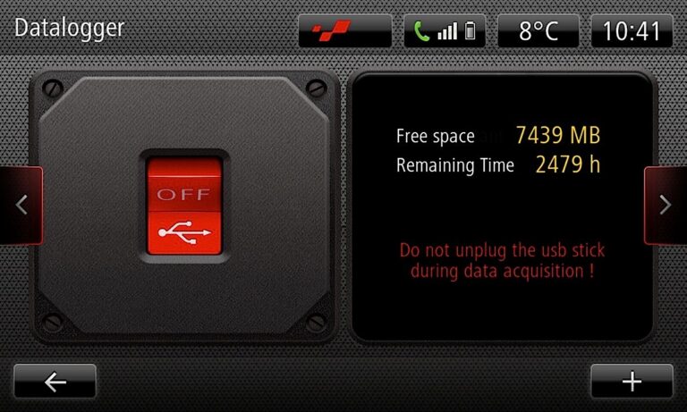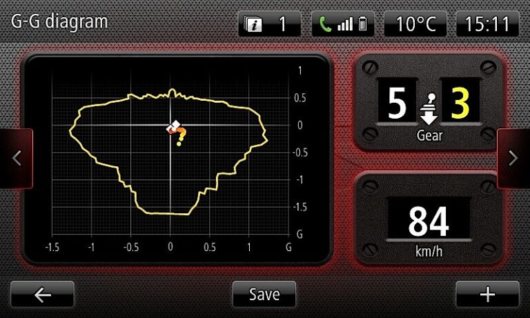 - Diagram G Siły: przyspieszenie wzdłużne i boczne, z wyświetleniem maksymalnych zarejestrowanych wartości. Zrzuty ekranowe można zapisać na pendrive.