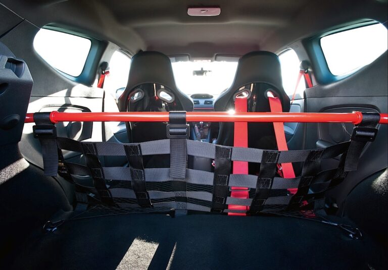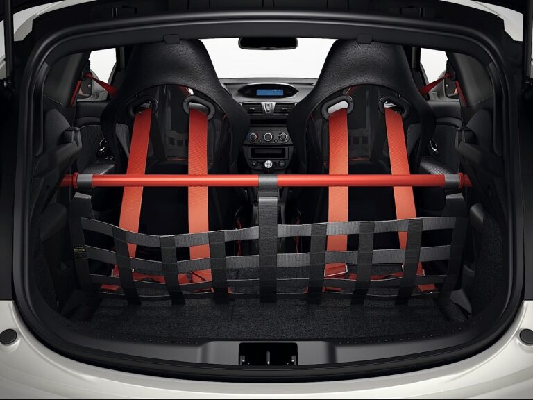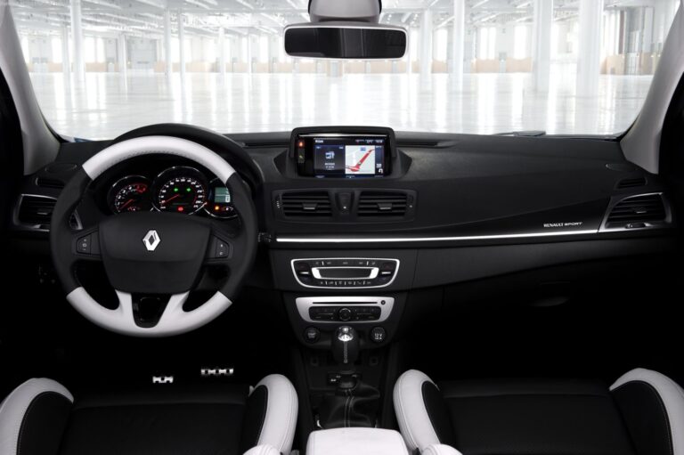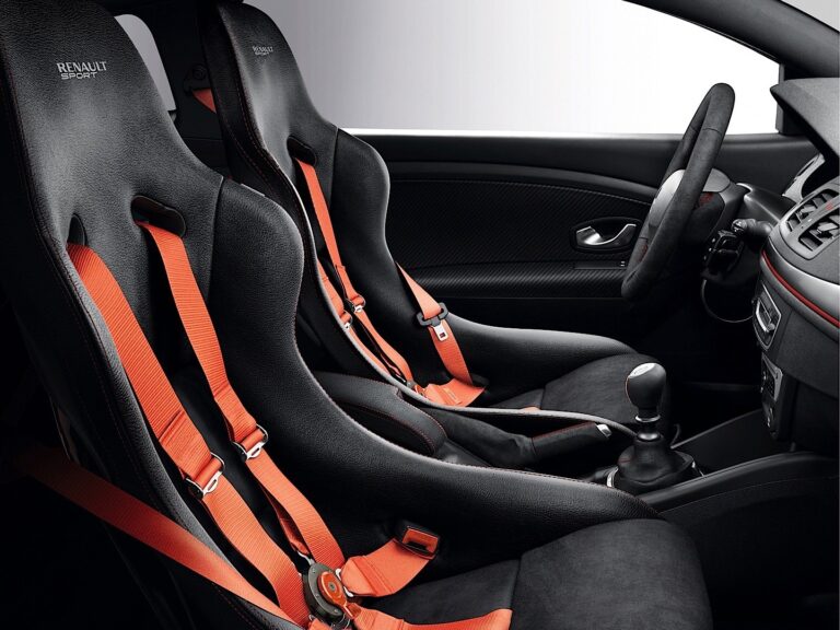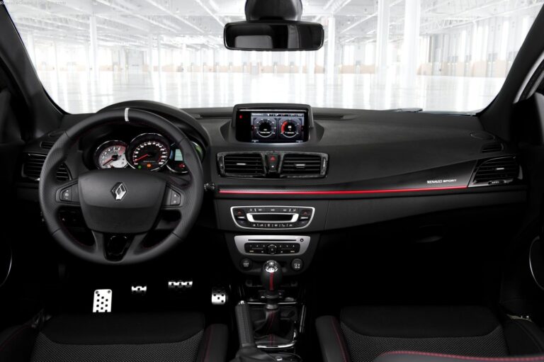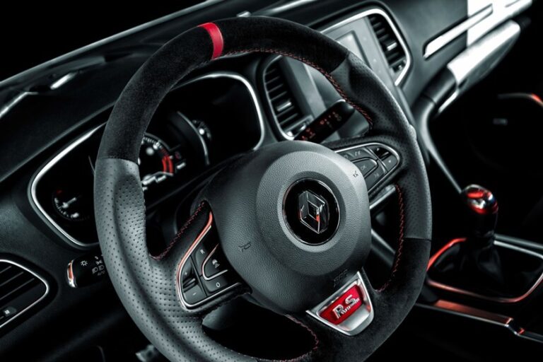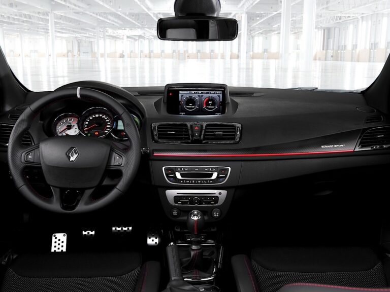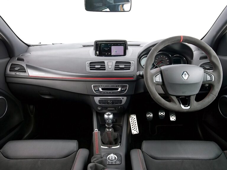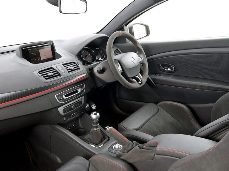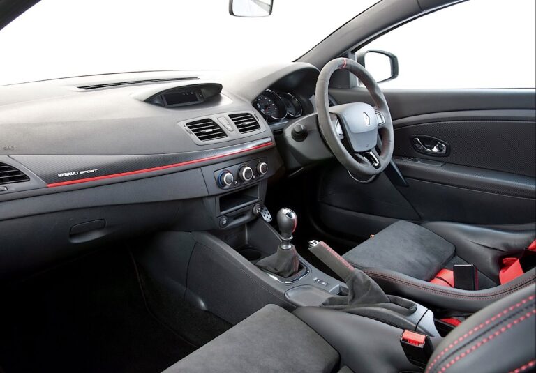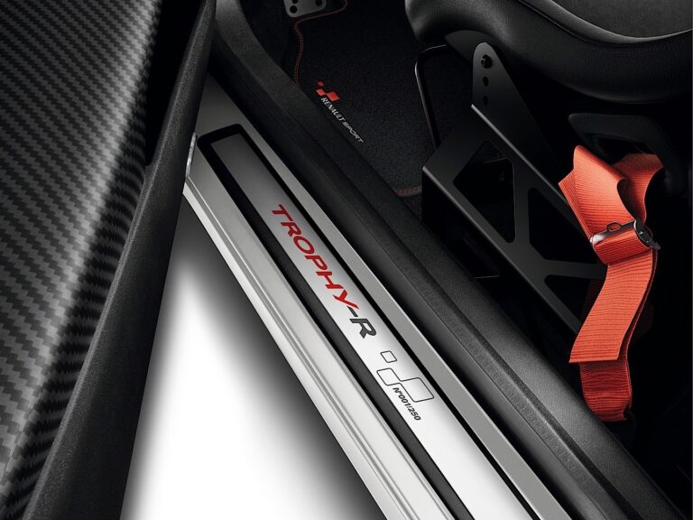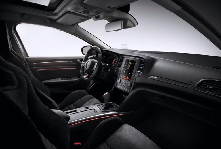 Wewnątrz, producent zamontował sportowe fotele Recaro w wersji RS Trophy. Renault użył Alcantary do tapicerki, kierownicy i hamulca ręcznego, a czerwone przeszycia znalazły się nawet na tylnej kanapie.