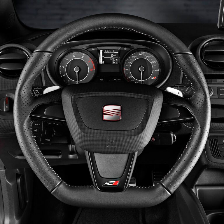 Seat Ibiza Cupra oferuje ekskluzywny design wnętrza z deska rozdzielcza, w której znajdują się błyszczące czarne elementy, takie jak panel radia, wloty wentylacyjne i osłona wskaźników. Kierownica w nowej Ibizie Cupra nie jest idealnie okrągła, lecz ma spłaszczoną podstawę, jak w pojazdach wyścigowych. Jej trzyramienna konstrukcja i boczne wgłębienia ułatwiają chwyt kierownicy, która jest regulowana pod względem wysokości i zasięgu.