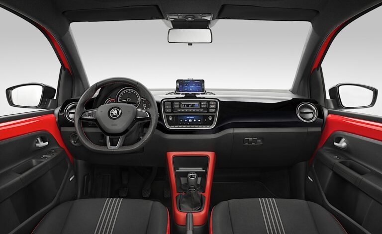 Deska rozdzielcza Skody Citigo ma schludny, przejrzysty design. Zestaw wskaźników z wskaźnikiem prędkości, obrotomierzem i wskaźnikiem poziomu paliwa ma nowy wygląd i oferowany jest w dwóch różnych wersjach. Standardowa, trójramienna kierownica z logo Skody jest teraz dostępna jako kierownica wielofunkcyjna z pokryciem skórzanym (standard w specjalnej edycji Skoda Citigo Monte Carlo oraz w modelu specjalnym Skoda Citigo FUN, opcjonalnie w wersjach Ambition i Style). Jej przyciski umożliwiają obsługę radia i sparowanego telefonu bez konieczności zdejmowania rąk z kierownicy. System Climatronic (opcjonalnie od poziomu Ambition) zapewnia przyjemną temperaturę przez cały czas.