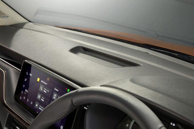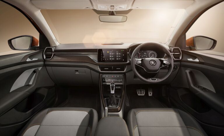 Wnętrze KUSHAQ dominuje centralny, wolnostojący ekran dotykowy infotainment; linia charakterystyczna biegnąca poniżej nawiązuje do sylwetki grilla ŠKODY. Unikalna przestrzeń do przechowywania została specjalnie zaprojektowana z myślą o potrzebach indyjskich klientów: na desce rozdzielczej znajduje się miejsce na przywiązany talizman, który można mieć na widoku. Dwuramienna, wielofunkcyjna kierownica w najnowszym stylu ŠKODY jest standardem. Od wersji Ambition w górę jest wykończona skórą, a pojazdy z automatyczną skrzynią biegów lub DSG mają także łopatki do zmiany biegów. Wszystkie warianty nowego SUV-a oferują liczne schowki w wnętrzu o łącznej pojemności do 26,2 l. Należą do nich na przykład schowek o pojemności 6,1 litra, który jest klimatyzowany od poziomu Ambition w górę, oraz Jumbo Box o pojemności 2,2 l w konsoli centralnej. W przednich i tylnych panelach drzwi jest dużo miejsca na przechowywanie butelek i innych przedmiotów. Uchwyt na kubki znajduje się w podłokietniku tylnej kanapy, która składa się w proporcji 60:40 od poziomu Ambition w górę. W wersji Ambition znajduje się również schowek w podsufitce z przodu do przechowywania okularów przeciwsłonecznych, aby zawsze były w zasięgu ręki.