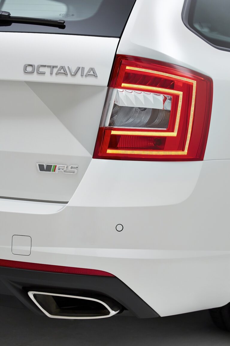 Zarówno w wersji sedan, jak i kombi, mocny, czarny element dyfuzora oraz szeroki reflektor nad nim dominują w tylnej części Octavii RS. Oba elementy są charakterystycznymi cechami nowej Škody Octavia RS, tak samo jak szerokie, trapezoidalne chromowane końcówki wydechu. LED-owe światła tylne w typowym kształcie C Škody są teraz standardowym wyposażeniem. W sedanach spojler znajduje się na tylnej klapie, podczas gdy w Skodzie Octavia Combi RS jest zamocowany na krawędzi dachu.