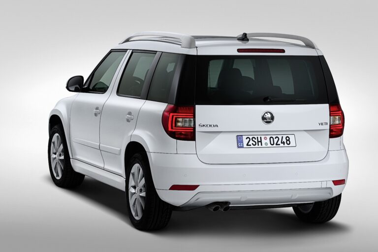 Nowy tył Yeti również ma nowy układ, w tym nowy kształt klapy bagażnika z charakterystycznymi światłami tylnymi, które są teraz w jeszcze dokładniej uformowanym kształcie C, opcjonalnie dostępne jako LED-y, oraz, zgodnie z nowym wyglądem Skody, dwa kubistyczne elementy trójkątne obok nowego logo Skody.