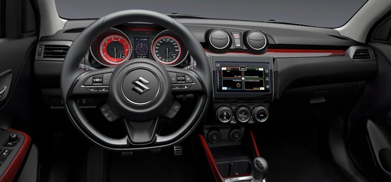 Nowy Swift Sport tworzy immersyjną, interaktywną atmosferę sportowej jazdy, zaczynając od czerwonych akcentów we wnętrzu oraz zorientowanej na kierowcę konsoli instrumentów, która natychmiast pobudza wyobraźnię kierowcy. Główne wskaźniki są wyraźne dzięki kontrastującym kolorom, a nowe wskaźniki doładowania i temperatury oleju wzbogacają doświadczenia ze sportowej jazdy. Wnętrze wykorzystuje precyzyjnie wykonane, wysokiej jakości tekstury i materiały, w tym semi-bucketowe fotele z przodu, które pozwalają kierowcy i pasażerowi dzielić się wrażeniem ze sportowej jazdy.
