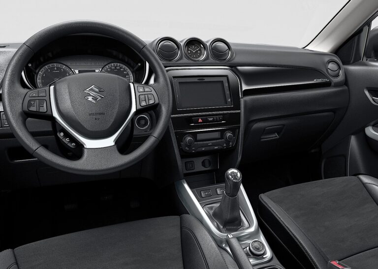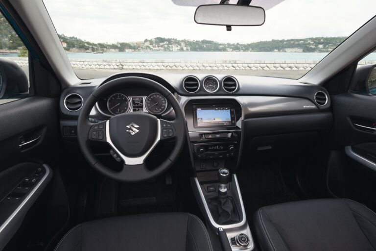 Wyrazisty kształt ozdoby deski rozdzielczej oraz U-kształtny design wokół dźwigni zmiany biegów podkreślają wytrzymałość SUV-a. Okrągły zegar oraz wloty powietrza, które są motywami z Grand Vitara, nadają wnętrzu młodzieńczy, sportowy charakter.