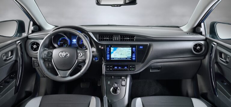 Wewnątrz Auris Hybrid znajduje się unikalny projekt wskaźnika i monitor Eco Drive Support w zestawie wskaźników kierowcy, dźwignia zmiany biegów hybrydowego z niebieskim podświetleniem oraz hybrydowa ornamentacja na panelu wskaźników.
