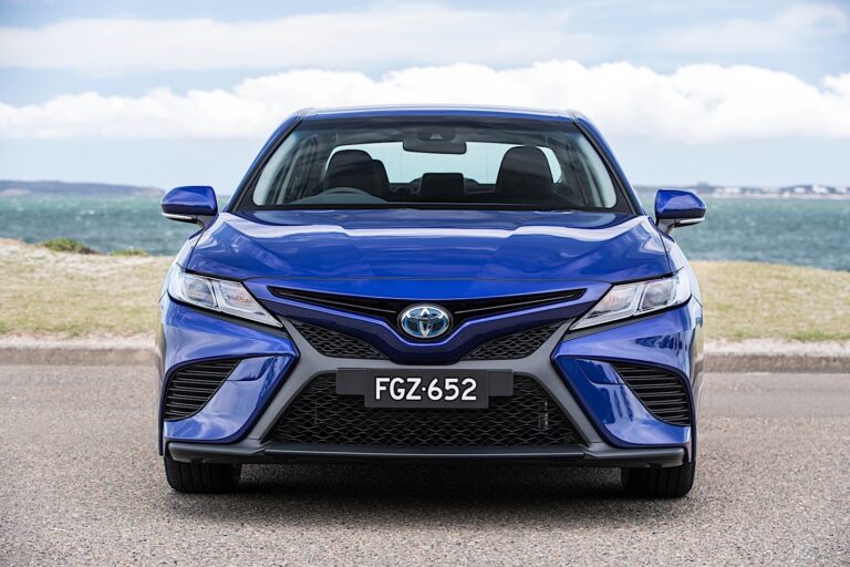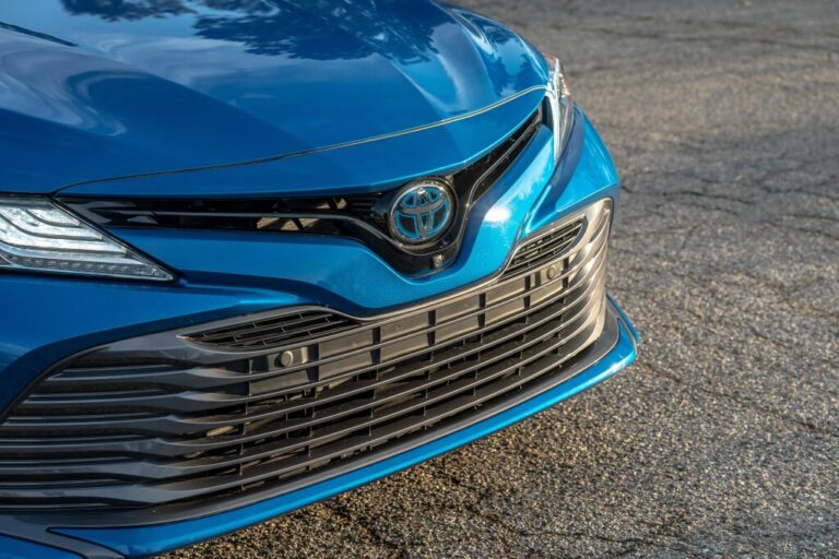 Nowa Toyota Camry ma twarz podkreśloną dwuczęściową kratką składającą się z płynnych cienkich i grubszych elementów – kluczowych elementów filozofii projektowej Camry „Keen Look”. Krągły, o 1,6 cala niższy, kaptur idealnie leży nad najwyższą częścią kratki, która pomieści dominujący emblemat Toyoty. W modelu hybrydowym emblemat ma wyraźny niebieski odcień. Ta modna kombinacja kratki, kaptura i emblematu płynnie łączy się z słupkiem A, tworząc postawę, która jest niewątpliwie bardziej agresywna niż u któregokolwiek poprzednika.