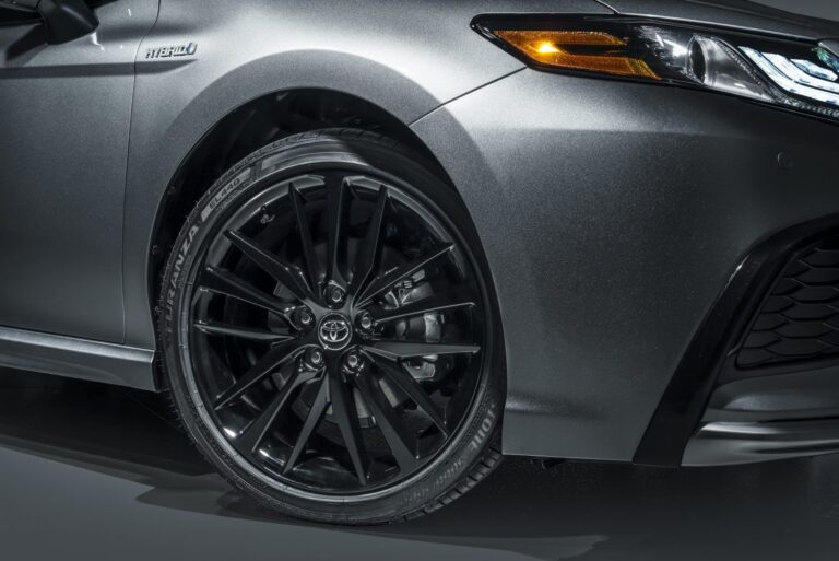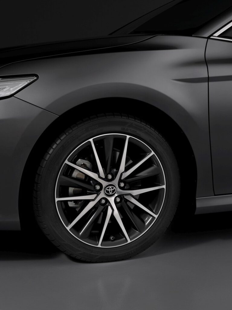 Zawieszenie dostrojone przez TRD obniża Camry o 0,6 cala, co zmniejsza środek ciężkości i daje bardziej agresywny wygląd. Sztywniejsze sprężyny i stabilizatory zwiększają sztywność przyczepności o 44 procent z przodu i 67 procent z tyłu. Unikalny zestaw amortyzatorów TRD, 19-calowe matowe czarne felgi i opcjonalne opony letnie Bridgestone Potenza 235/40R19 dopełniają pakiet podwozia, który poprawia kontrolę nad nadwoziem, zwinność prowadzenia i precyzję kierowania.