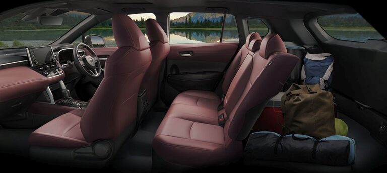 Corolla Cross oferowała do pięciu miejsc wewnątrz i obiecywała większą przestronność dla pasażerów z tyłu. Ponieważ samochód miał tę samą rozstaw osi co C-HR, przestrzeń na nogi była taka sama. W desce rozdzielczej Corolla Cross czerpała więcej elementów z normalnej, kompaktowej wersji. Na szczycie centralnej konsoli zainstalowano uniesioną jednostkę multimedialną. Zestaw wskaźników miał te same analogowe wskazówki co Corolla.