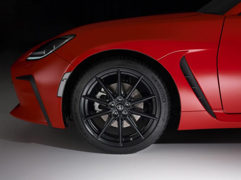 Model podstawowy GR 86 stoi na 17-calowych aluminiowych felgach o V-kształtnym wykończeniu i 10 ramionach, obutych w opony Michelin® Primacy HP®. Wersja Premium GR 86 jest wyposażona w 18-calowe czarne aluminiowe felgi z wyglądem inspirowanym japońskim mieczem i oponami Michelin Pilot Sport 4®. 18-calowe felgi mają krzyżowe ramiona dla sztywności strukturalnej oraz minimalnie powiększone otwory na nakrętki, tworząc zwarty piastę. Hamulce zasilane są przez wspomagane siłą hamulce wentylowane o średnicy 11,6 cala z przodu i 11,4 cala z tyłu.