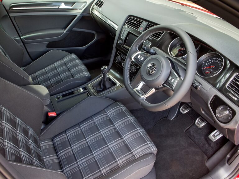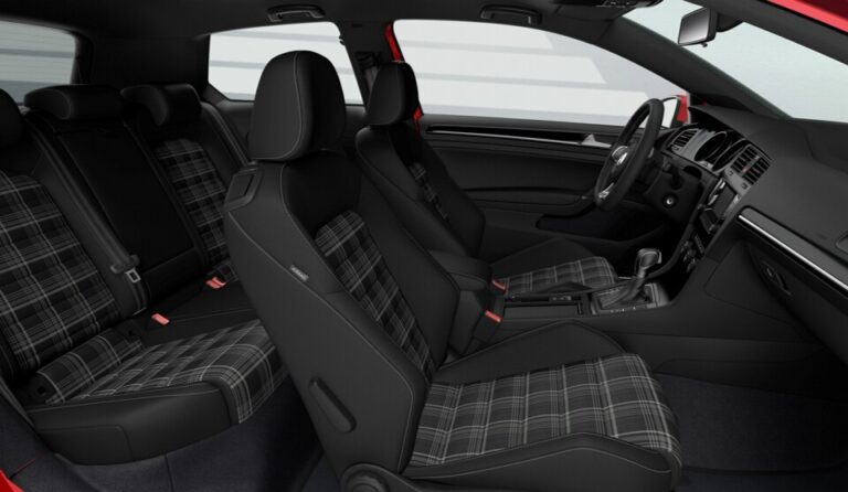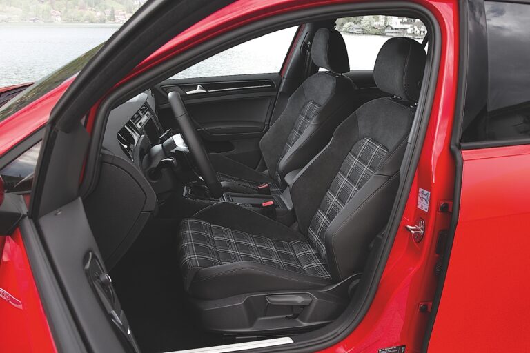 Pasażerowie wchodzą do wnętrza przez standardowe, białe podświetlane listwy progowe ze stali nierdzewnej. Kierowca i pasażer z przodu siadają na sportowych fotelach wykończonych klasycznym szkockim wzorem, zwanym „Clark” w GTD (i GTI). Fotele GTI i GTD są identyczne pod względem koncepcji. Z przodu oba są wyposażone w regulację wysokości, manualne wsparcie lędźwiowe i kieszeń na oparciu. Ich właściwości ergonomiczne są idealne. Wizualnie, zamiast czerwonych elementów GTI, GTD ma melange czarnych, szarych i białych odcieni oraz elementy chromowane. Opcjonalnie można zamówić wnętrze skórzane („Wiedeń”). Czarna podsufitka dopełnia sportowy klimat w górę.