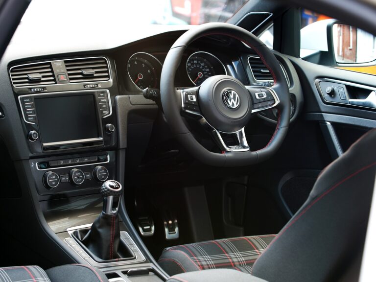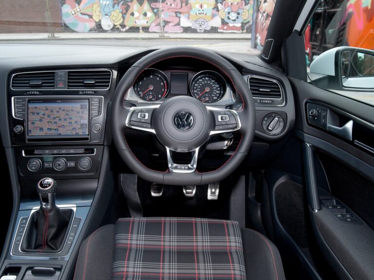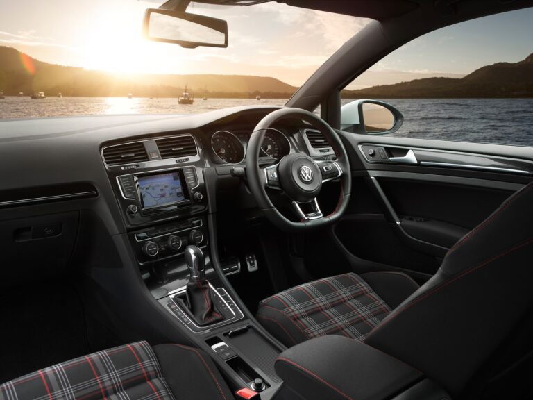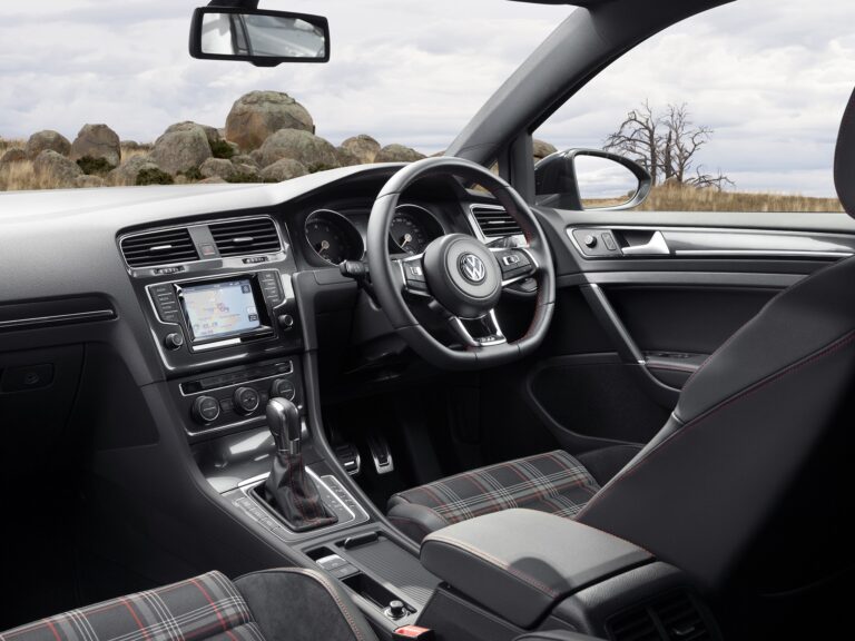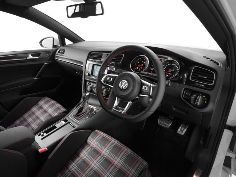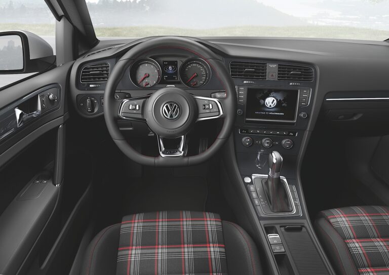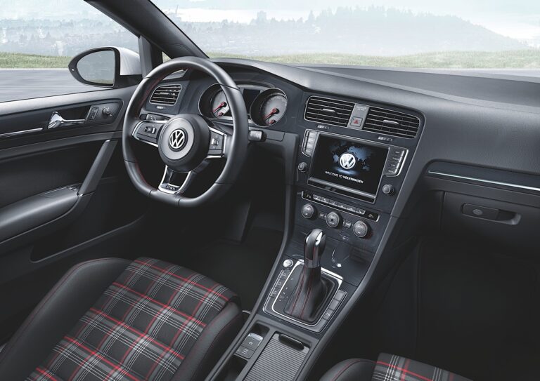 Jakość i wizerunek przekraczają granice klas. To całkowicie nowa koncepcja fundamentalna dla projektowania wnętrza siódmej generacji Golfa, która reprezentuje przełom w sportowej i wysokiej jakości architekturze wnętrz GTI: szczególnie zauważalna jest szeroka konsola centralna, która jest skierowana w stronę kierowcy; jest bardziej charakterystyczna dla klasy premium niż klasy kompaktowej. Pośrodku konsoli centralnej, pod przełącznikiem świateł awaryjnych, znajduje się pięciocalowy do ośmiocalowego dotykowy ekran informacyjny z jego przyciskami menu i pokrętłami. Po raz pierwszy Volkswagen stosuje tutaj generację ekranów dotykowych (opcjonalnie), która zawiera czujniki zbliżeniowe oraz funkcjonalność reagującą na gesty przesuwania palców (gesty przesuwania i powiększania jak w smartfonie).