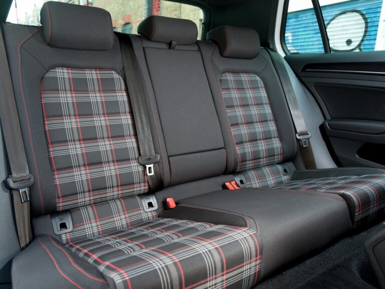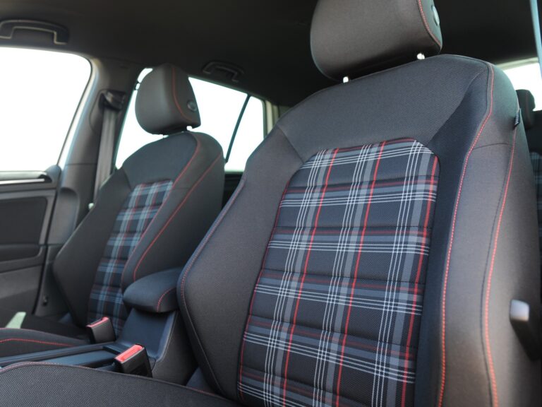 Typowe insygnia GTI są ważne również we wnętrzu. Weźmy pod uwagę pokrowce na siedzenia: pierwszy GTI miał już pokrowce na siedzenia w legendarnym wzorze kratkowym. Tkanina Golfa GTI VI znana jako „Jacky” została – jak w przypadku każdej nowej generacji GTI – przeprojektowana i nosi teraz nazwę „Clark”. Oczywiście wzór kratkowy został zachowany. Fotele sportowe oferują wyjątkowo dobre właściwości ergonomiczne. Dodatkowo, przednie fotele mają regulację wysokości i manualnie regulowane podparcie lędźwiowe. Czerwone dekoracyjne szwy zapewniają sportowy kontrast; czarna podsufitka, która zawsze jest częścią GTI podkreśla sportowy układ wnętrza.