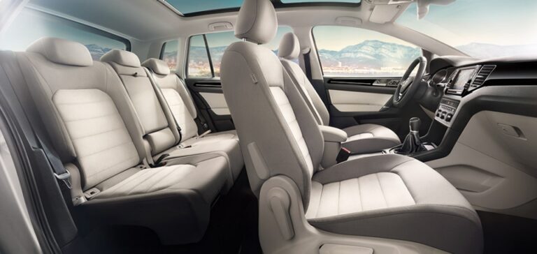 Volkswagen Golf Sportsvan oferuje znacznie więcej przestrzeni w tylnej części siedzeń niż poprzedni model, dzięki wydłużonemu rozstawowi osi i większemu zwisowi tylnemu. Maksymalna odległość między punktami H przednich i tylnych siedzeń wzrosła z 865 mm do 898 mm dla drugiego rzędu siedzeń (tylna kanapa ustawiona w tylniej pozycji). W praktyce te 33 mm mają ogromny pozytywny wpływ, ponieważ nawet osoby o wzroście 1,90 m mogą teraz wygodnie siedzieć jedna przed drugą. Przyjazną atmosferę zapewniają również opcjonalne jasne wnętrze w kolorze „Ceramique” oraz duży panoramiczny szklany dach, którego przezroczysta powierzchnia sięga do tylnej części siedzeń. Praktyczne są to kieszenie i składane stoliki zintegrowane w oparciach przednich siedzeń, które są standardem od wersji „Comfortline”. Dodatkowo, w tylnym podłokietniku, który się składa, znajdują się trzy dodatkowe uchwyty na kubki (2 na standardowe kubki i 1 na węższe kubki), co jest standardem od Golfa Sportsvan Comfortline (opcjonalnie dla Trendline).
