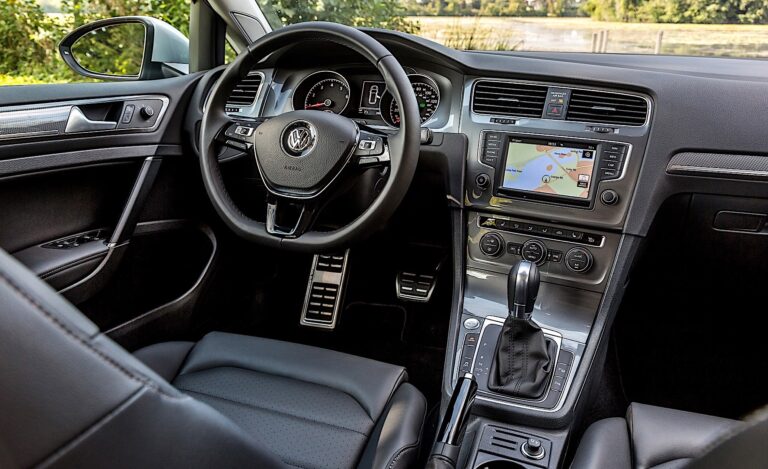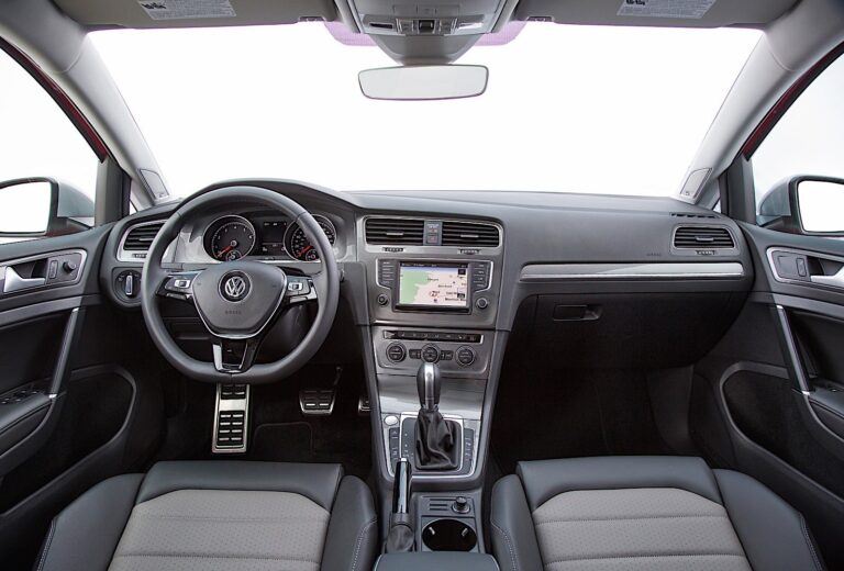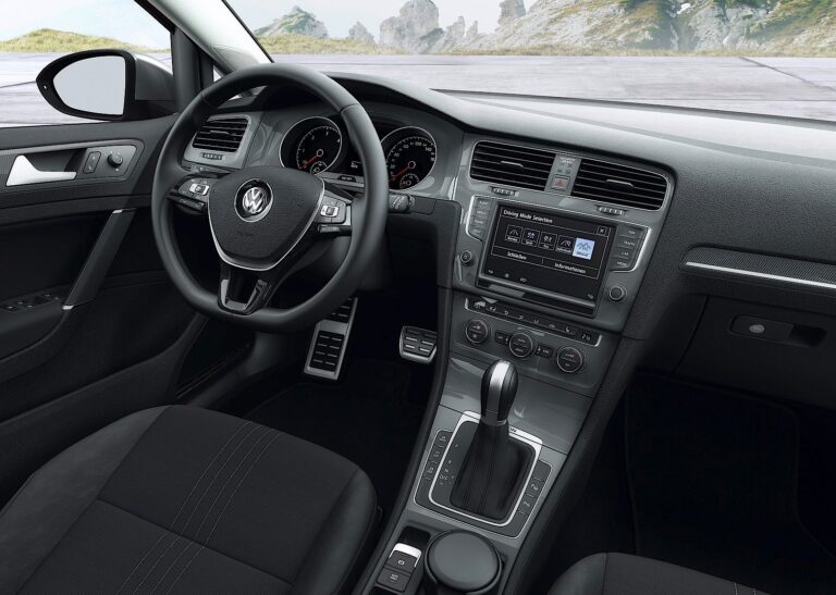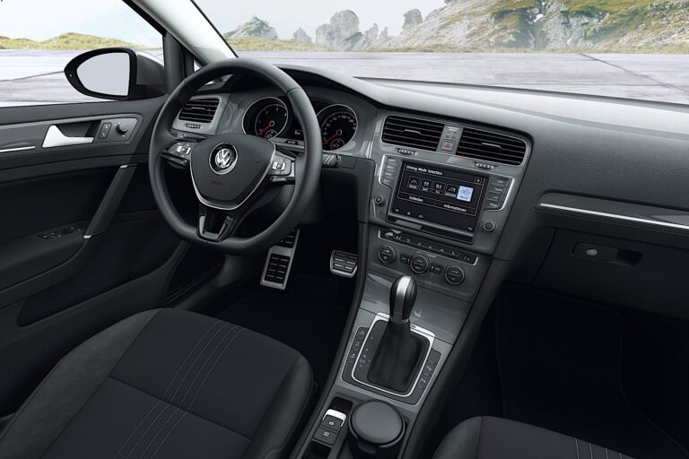 Wnętrze samochodu różni się od innych wersji Golfa VII. Posiada skórzaną kierownicę i dźwignię zmiany biegów. Emblemat „Alltrack” jest widoczny na tylnych oparciach przednich siedzeń. Inne standardowe funkcje, w zależności od poziomu wyposażenia, to automatyczna klimatyzacja, LED-owe lampki do czytania dla przednich i tylnych siedzeń oraz w strefie podłogowej. Na konsoli centralnej znajduje się chromowana listwa z napisem „4MOTION” oraz stalowe listwy progowe z napisem „Alltrack”.