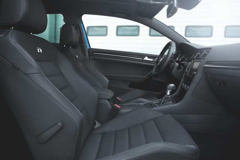 Tak jak w trzech poprzednich modelach Golfa R, Volkswagen R GmbH szeroko dostosował i unowocześnił wnętrze nowego modelu. Ten najsilniejszy Golf wyposażony jest w tzw. sportowe fotele (przednie). Środkowe panele zaprojektowane są w tkaninie „Race” („Titan Black”) z czarnymi przeszyciami. Z kolei panele boczne wykonane są z Alcantary („Crystal Grey”). Zewnętrzne powierzchnie siedzeń i zagłówków zaprojektowane są w obiciu tkaninowym „Clip” („Titan Black”). Dekoracyjne szwy w „Crystal Grey” stanowią kontrast do ciemnych obszarów. Logo „R” jest wytłoczone na oparciach przednich foteli.