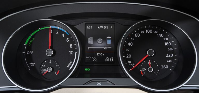 Po lewej stronie zestawu wskaźników miernik mocy Passata GTE uzupełnia obrotomierz i pokazuje informacje, takie jak to, czy akumulator wysokiego napięcia jest ładowany przez regenerację, czy też – i ile – energii jest konsumowane. Prędkościomierz nadal znajduje się po prawej stronie. Kolorowy wyświetlacz (multifunkcyjny wyświetlacz Premium), który znajduje się między miernikiem mocy a prędkościomierzem, nieustannie pokazuje zasięg elektryczny i bieżący tryb pracy. W osobnym polu LED w dolnej części wyświetlacza multifunkcyjnego po uruchomieniu e-silnika również pojawia się komunikat „READY”, informujący, że samochód jest gotowy do jazdy. Dzieje się to dlatego, że e-silnik nie jest słyszalny, gdy samochód stoi.