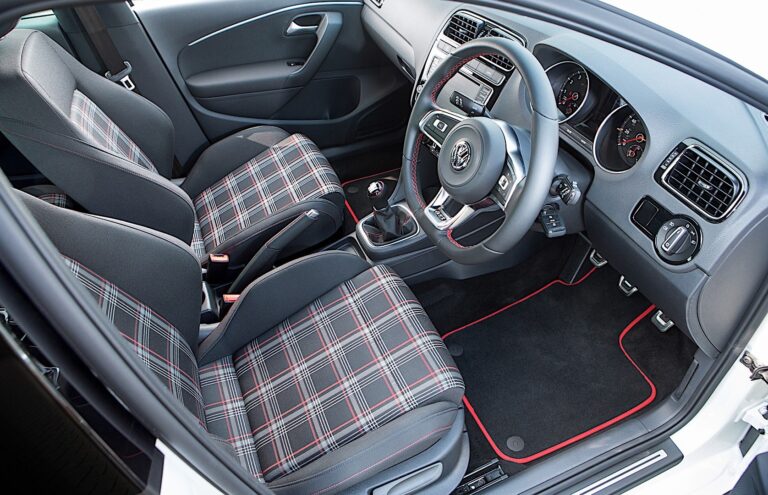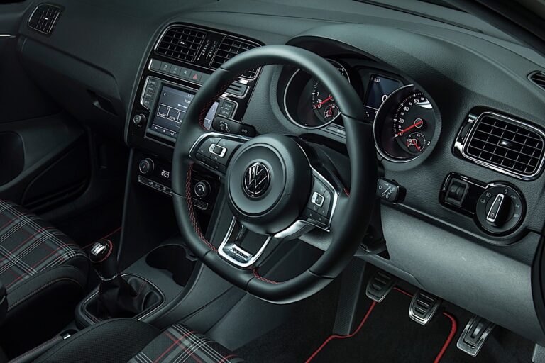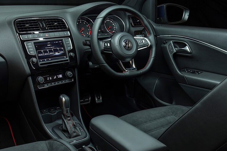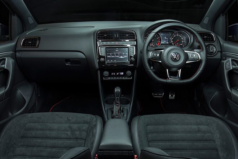 Wnętrze przypomina Golf GTI w mniejszej skali. Znajdziemy tu ten sam design kierownicy GTI, deskę rozdzielczą GTI oraz materiał na siedzenia, który jest podobny do tego z większego brata. Ogólny wygląd deski rozdzielczej nie różni się znacząco od innych modeli Polo. Jednostka infotainment pozostaje ta sama, ale jest dobra, z wystarczająco dużym ekranem dotykowym i kilkoma przyciskami.