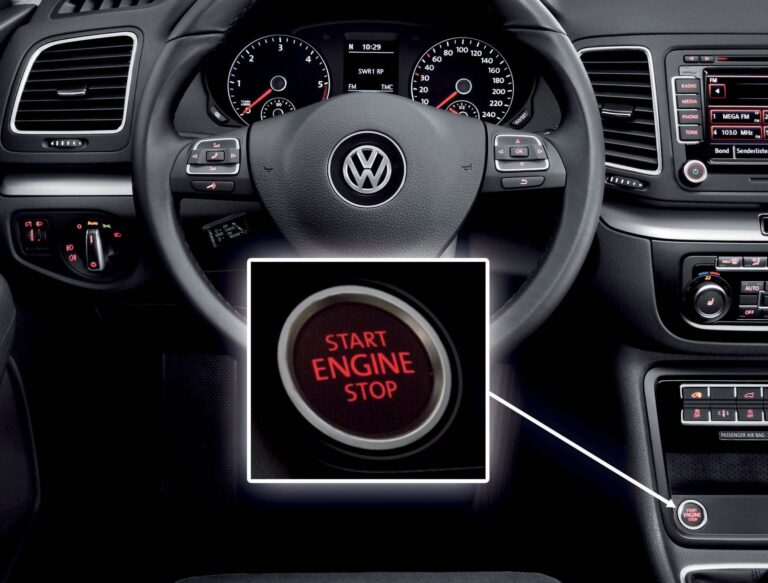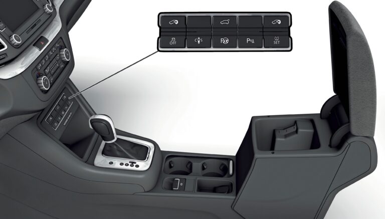 Znajdujący się poniżej wyświetlacza i idealnie umiejscowiony, aby można było łatwo do niego dotrzeć, znajduje się przycisk ostrzegawczy. Nad nim, jak zwykle w VW Sharan, w wszystkich modelach od Comfortline w górę znajduje się zamykana komora składowa. Najniższy poziom konsoli centralnej zawiera kolejny rząd przełączników do rzadziej używanych funkcji, takich jak tymczasowe dezaktywowanie ESP czy systemu Park Assist. W przypadku Volkswagena Sharana, który został zamówiony z systemem Kessy (automatyczne zamykanie i uruchamianie – nowość w tym modelu), przycisk uruchamiania silnika znajduje się bezpośrednio przed dźwignią zmiany biegów na konsoli centralnej. Zintegrowane w typowej pozycji między siedzeniami znajduje się „dźwignia hamulca ręcznego”. Niemniej jednak nie jest to już dźwignia, ponieważ hamulec ręczny jest aktywowany elektronicznie w całej gamie – to teraz intuicyjnie obsługiwany przycisk.