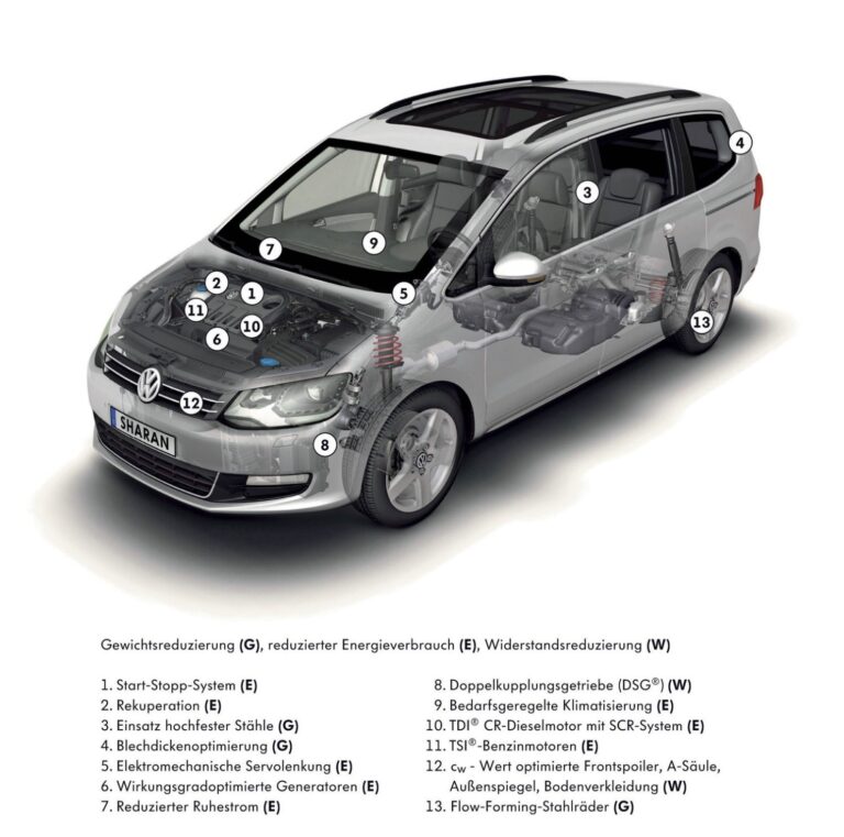 Cztery silniki Volkswagena Sharana z bezpośrednim wtryskiem paliwa TSI oraz turbo-diesla TDI są aż o 21 procent bardziej oszczędne! Dwa silniki TSI osiągają moc 110 kW / 150 PS i 147 kW / 200 PS, podczas gdy silniki TDI generują 103 kW / 140 PS i 125 kW / 170 PS. Przy mocach dochodzących do 170 PS silniki wykorzystują system start-stop oraz regenerację energii (odzyskiwanie energii kinetycznej, która jest tymczasowo przechowywana w akumulatorze). Przy średnim zużyciu wynoszącym 5,5 litra na 100 km (51,4 mpg, 145 g/km CO), 140-konny VW Sharan 2.0 TDI – maksymalna prędkość 194 km/h (119 mph) – ustanawia nowy standard efektywności paliwowej w tym segmencie rynku! Teoretyczny zasięg jest równie imponujący: 1 273 kilometry (805 mil) z jego 70-litrowego zbiornika paliwa. Oba silniki TDI są również wyposażone w katalizator SCR (SCR = selektywna redukcja katalityczna), który szczególnie eliminuje tlenki azotu (NOx), co sprawia, że Volkswagen Sharan, nawet jako turbo-diesel, jest jednym z najczystszych MPV na świecie.