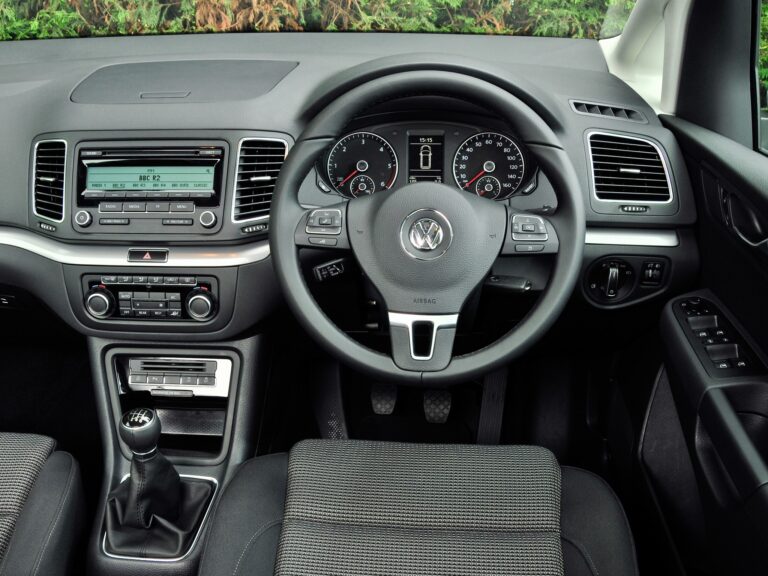 Wewnątrz Volkswagen Sharan Trendline wyposażony jest w atrakcyjne tkaninowe fotele (w kolorze 'Titanium Black’ z wzorem 'Move’), regulowane siedzenie kierowcy, matowe chromowane wsparcia, do 33 schowków, regulowane podłokietniki (które mogą być również przesuwane do przodu i do tyłu i zawierać dodatkową przestrzeń schowkową), podłogę bagażnika z oddzielnymi, zamykanymi przegrodami (5-osobowy), osłonę bagażnika oraz automatyczne zamykanie drzwi przy ruszaniu (można dezaktywować). Jak wspomniano powyżej, w zakresie funkcjonalnego wyposażenia wiele funkcji jest dostępnych w standardzie, np. centralne zamykanie z pilotem RF, elektro-mechaniczny, regulowany w zależności od prędkości układ kierowniczy, w pełni regulowana kolumna kierownicza, elektryczne okna we wszystkich drzwiach, półautomatyczna klimatyzacja (’Climatic’) oraz system radio/CD 'RCD 210′ z czterema głośnikami – długa, ale nie wyczerpująca lista!