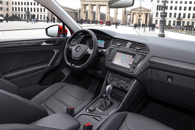 Wnętrze Tiguan, które również zostało całkowicie przeprojektowane, ma wyraźnie sportowy, ale jednocześnie świadomy charakter SUV-a. W ramach tej wizji konsekwentnie zrealizowano kierowczo-ukierunkowaną koncepcję deski rozdzielczej. Centralnymi elementami są zestaw wskaźników (opcjonalnie realizowany jako cyfrowy wyświetlacz Active Info) oraz system infotainment, który jest umieszczony wysoko w centrum i skierowany w stronę kierowcy. Pod systemem infotainment znajduje się sportowa konsola centralna z kontrolkami klimatyzacji, również pochylona w stronę kierowcy. Deska rozdzielcza i konsola centralna tworzą tu jedną stylistyczną jednostkę. Sama konsola centralna jest zdominowana przez szereg przycisków, które są rozmieszczone wokół podwyższonej pozycji dźwigni zmiany biegów. Tak jak w przypadku zewnętrznej, projektanci konsekwentnie zastosowali zasadę „Forma podąża za funkcją” również tutaj. Układ przycisków wydłuża się ukośnie po stronie kierowcy. Optymalnie dostępny jest tu okrągły, intuicyjnie obsługiwany wielofunkcyjny przełącznik nowego systemu 4MOTION Active Control. Współpraca deski rozdzielczej, konsoli centralnej i paneli drzwiowych tworzy wyjątkową atmosferę kokpitu dla kierowcy. Przykład perfekcji w detalach: wąskie, precyzyjnie wykorzystywane ramki w wyglądzie aluminium wokół wlotów powietrza i głośników drzwiowych. Typowa dla SUV odporność: klamki drzwi. Projektanci podkreślili również odczucie SUV w swoim wyborze faktur powierzchni i rozmieszczenia objętości. Wnętrze oznaczone jest wysokim poziomem przemyślanej ergonomii i intuicyjnych struktur operacyjnych. Warto zauważyć znacznie zwiększoną przestrzeń na głowę na tylnych siedzeniach, mimo niskiej wysokości nadwozia pojazdu.