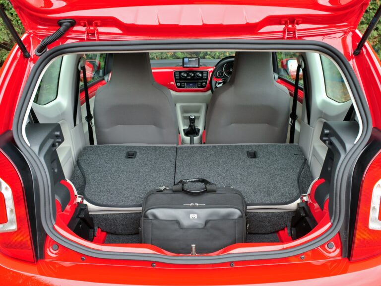 Przy pojemności 251 litrów bagażnik osiąga najlepszą wartość w swojej klasie, jeśli chodzi o ładowność. A gdy oparcie tylnej kanapy jest całkowicie złożone, up! może pomieścić 951 litrów ładunku. W takim przypadku powstaje prawie płaska powierzchnia ładunkowa. Ponieważ oparcie siedzenia pasażera z przodu można również złożyć, możliwe jest transportowanie dużego sprzętu sportowego lub mebli o długości do 2,0 metrów w up!. Sam bagażnik jest wykładzany wykładziną, a także osłona bagażnika, która otwiera się szeroko i może być łatwo usunięta w razie potrzeby. Opcjonalnie w up! dostępna jest regulowana podłoga bagażnika, którą można ustawić na dwóch poziomach. Na górnym poziomie, gdy tylna kanapa jest złożona (w zaledwie kilka sekund), górna pozycja podłogi bagażnika tworzy prawie poziomą powierzchnię ładunkową, a mniejsze przedmioty można również schować pod podłogą bagażnika na tym poziomie. Dolna pozycja podłogi bagażnika jest używana, gdy szczególnie duże i nieporęczne przedmioty muszą być umieszczone w bagażniku. Wszystkie te szczegóły pokazują, że wewnętrznie up! jest gigantem wśród małych samochodów.