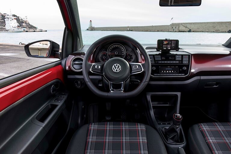 Pierwszy GTI miał teraz kultowy klasyczny wzór w kratkę w kolorze białym i czerwonym na czarnym tle. Oczywiście, centralne panele siedzeń nowego up! GTI również zyskały stylowy wygląd z tym materiałem. Nazywa się „clark” – tak samo jak w Polo GTI i Golfie GTI (gdzie jest pisane „Clark”). Zewnętrzne panele siedzeń są czarne. Dalsze emblematy GTI w wnętrzu pojazdu to wykończenia progów drzwi GTI, specjalny gałka zmiany biegów GTI oraz wielofunkcyjna kierownica specyficzna dla GTI z czerwonym przeszyciem oraz logo GTI na pionowej szprychy. Również dźwignia hamulca ręcznego jest pokryta skórą. Kolejnym „must have” w każdym GTI jest wykończenie dachu i ramy dachu w sportowej czerni. Odrobina klasy w wnętrzu pochodzi z subtelnego i atrakcyjnego podświetlenia ambientowego w kolorze czerwonym. Deska rozdzielcza z motywem „pixels red” jest kolorystycznie dopasowana do czarnych i czerwonych elementów wnętrza. Chromowane wykończenia wokół wentylacji, kontrolek i wskaźników tworzą elegancki kontrast. Górne panele drzwi są w kolorze nadwozia.